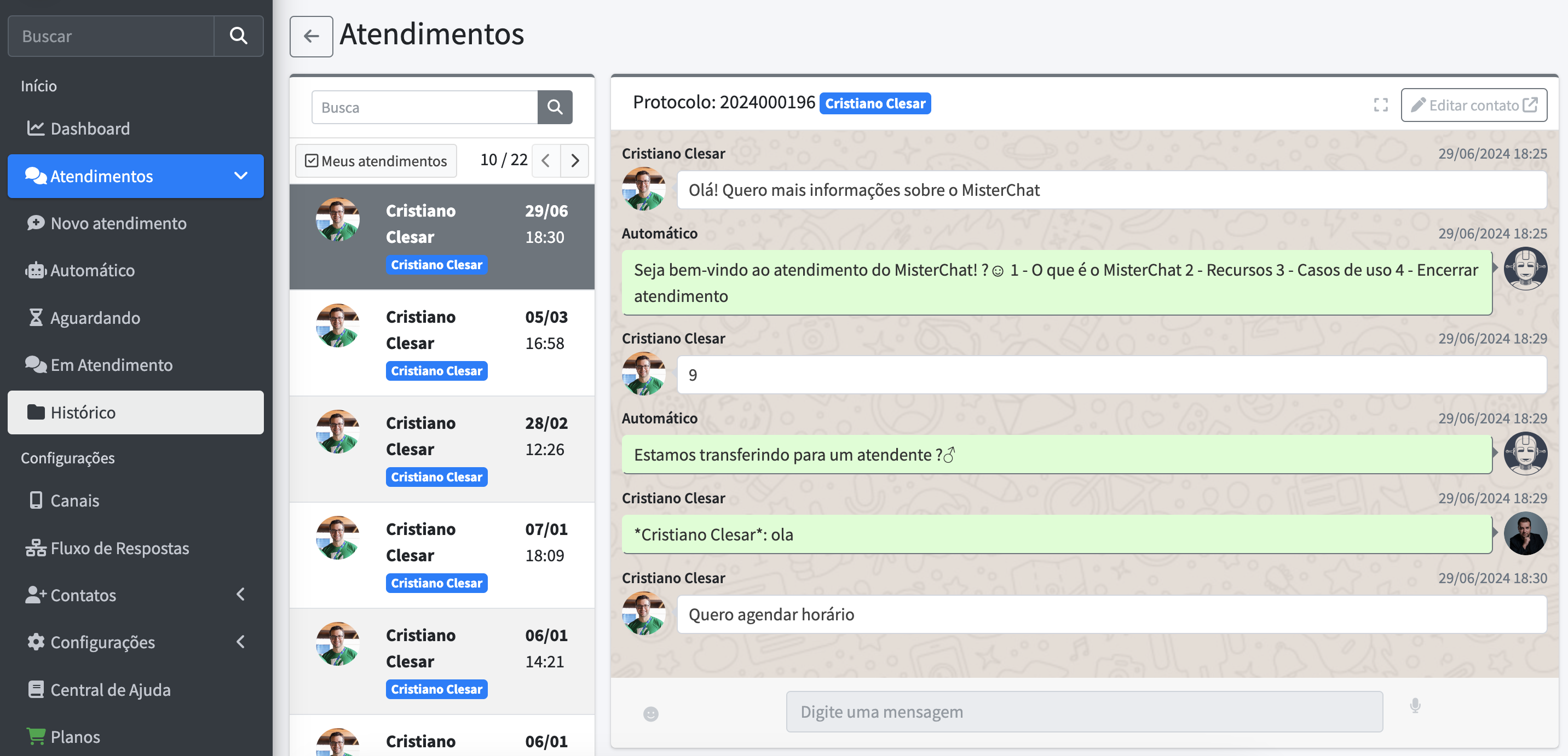 Para acessar o histórico de protocolos de atendimento acesse Atendimentos > Histórico. Você verá uma lista de atendimentos já encerrados.