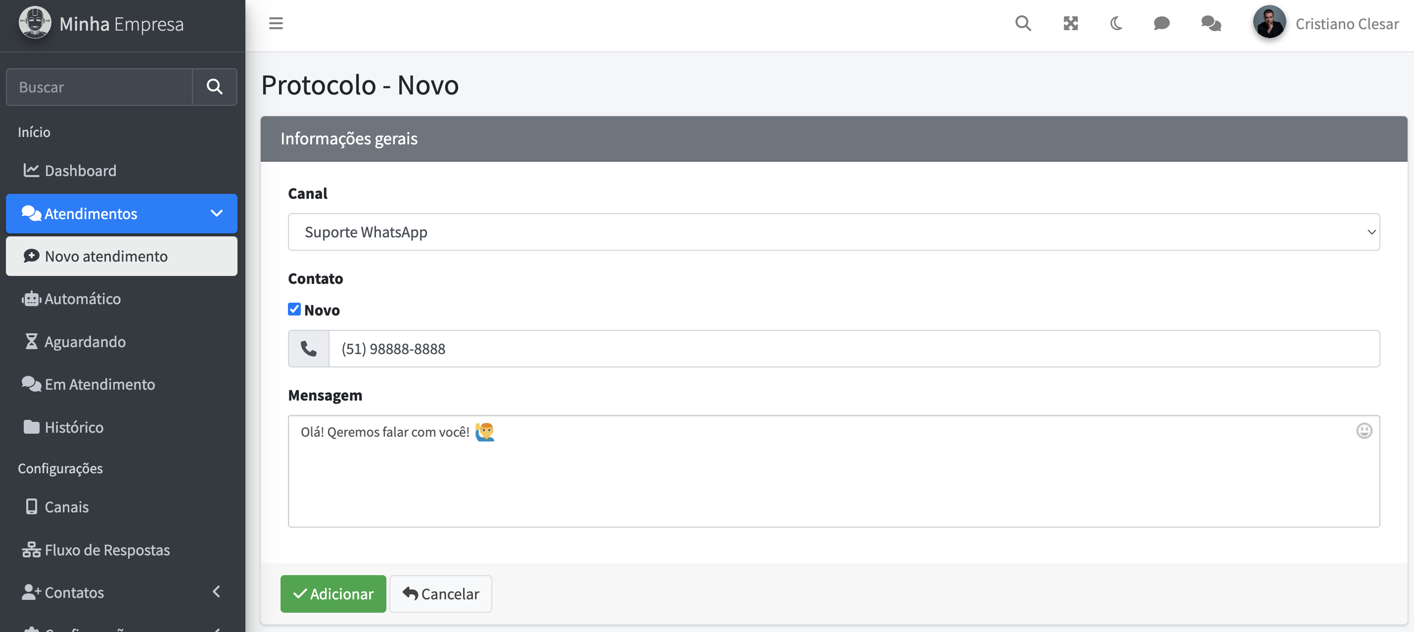 Para isso, basta clicar no menu Novo atendimento, selecionar o canal de WhatsApp a ser utilizado para enviar a mensagem, selecionar um dos seus contatos (ou inserir um novo número) e informar a mensagem a ser enviada para iniciar uma conversa.