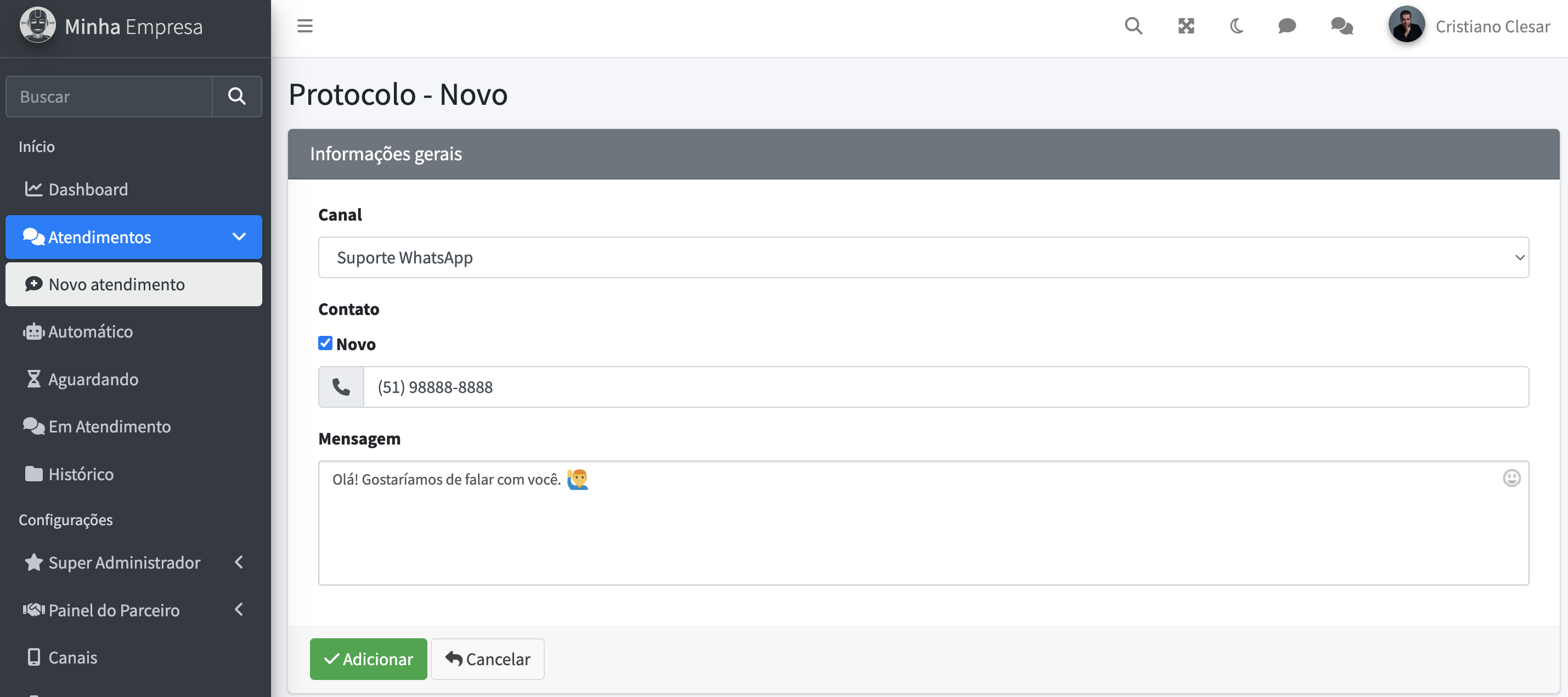 Para isso, basta clicar no menu Novo atendimento, selecionar o canal de WhatsApp a ser utilizado para enviar a mensagem, selecionar um dos seus contatos (ou inserir um novo número) e informar a mensagem a ser enviada para iniciar uma conversa.